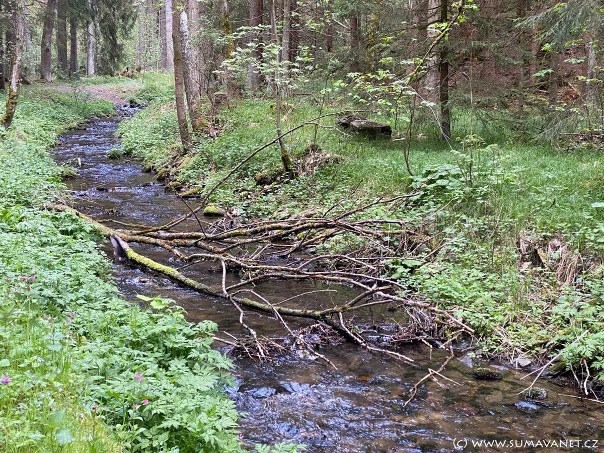 Na březích Zlatého potoka si můžete povšimnout rýžovnických sejpů.